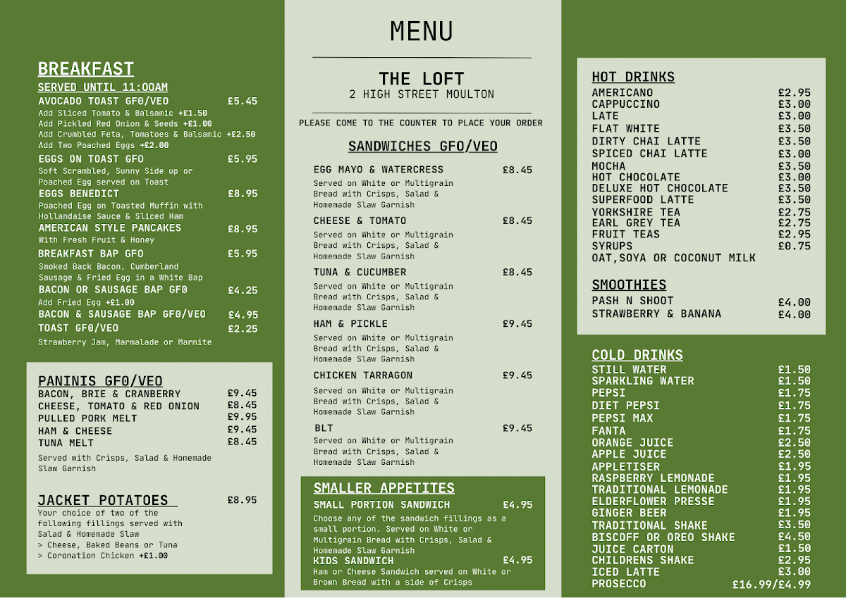 Nestled in the heart of Moulton, The Loft - Cafe & Lounge Bar is a charming haven for coffee aficionados and food lovers alike. Situated at 2 High St, this inviting café invites you to relax and unwind, featuring a delightful ambiance that is both welcoming and cozy. The allure of this local gem lies not just in its warm decor and tranquil vibes, but also in its commitment to serving high-quality, delicious meals that cater to a variety of dietary preferences, including vegan and gluten-free options.
